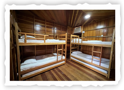 Nossos chalés rústicos são construídos inteiramente em madeira com telhados de palha. Possuem ar-condicionado e chuveiros quentes. As acomodações podem incluir três camas de solteiro, uma cama de casal ou beliches.